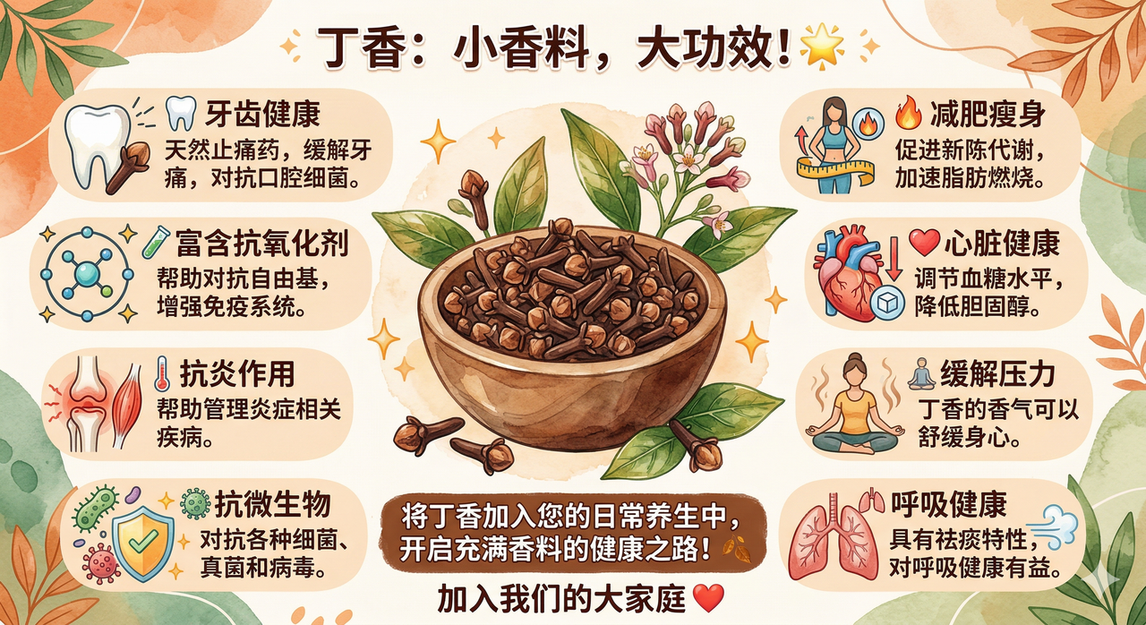 ❤️ 心脏健康:丁香有助于调节血糖水平,降低胆固醇,促进心脏健康。