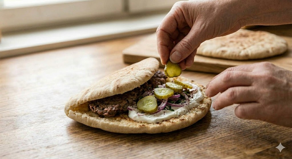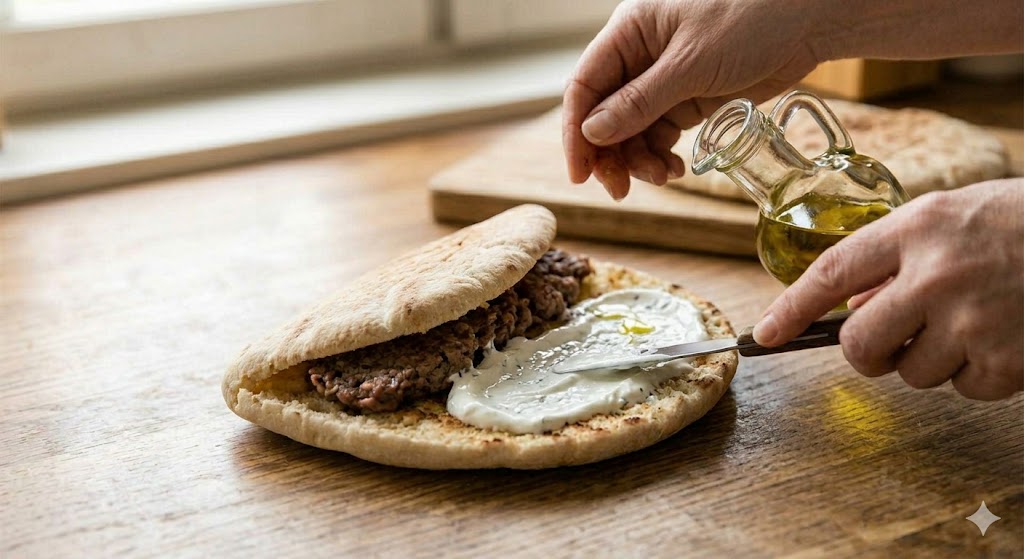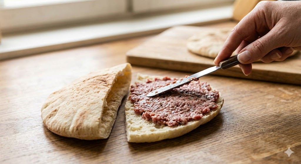 步骤:1️⃣ 将牛肉末、洋葱、欧芹、盐、黑胡椒和辣椒粉放入搅拌机或食品料理机中搅拌均匀。2️⃣ 将黎巴嫩薄饼切成两半并展开。在其中一半上均匀涂抹一层生肉混合物。3️⃣ 用另一半薄饼盖住,形成一个封闭的三明治。4️⃣ 用叉子轻轻压实,使馅料分布均匀。5️⃣ 将卷饼放入三明治压烤机或平底锅中烤5–10分钟,直至金黄色并完全熟透。6️⃣ 同时,准备白酱:将希腊酸奶与磨碎的黄瓜(挤干水分)、莳萝、大蒜粉、柠檬汁和盐混合。7️⃣ 将哈里萨辣酱、是拉差辣椒酱和少量水混合制成辣酱。8️⃣ 准备沙拉:将切成薄片的红洋葱与苏格兰山艾和切碎的欧芹混合。9️⃣ 烤好后,将卷饼稍微打开,涂抹白酱,淋上辣酱和橄榄油。🔟 顶上洋葱欧芹沙拉和泡菜,合上卷饼,趁热享用。